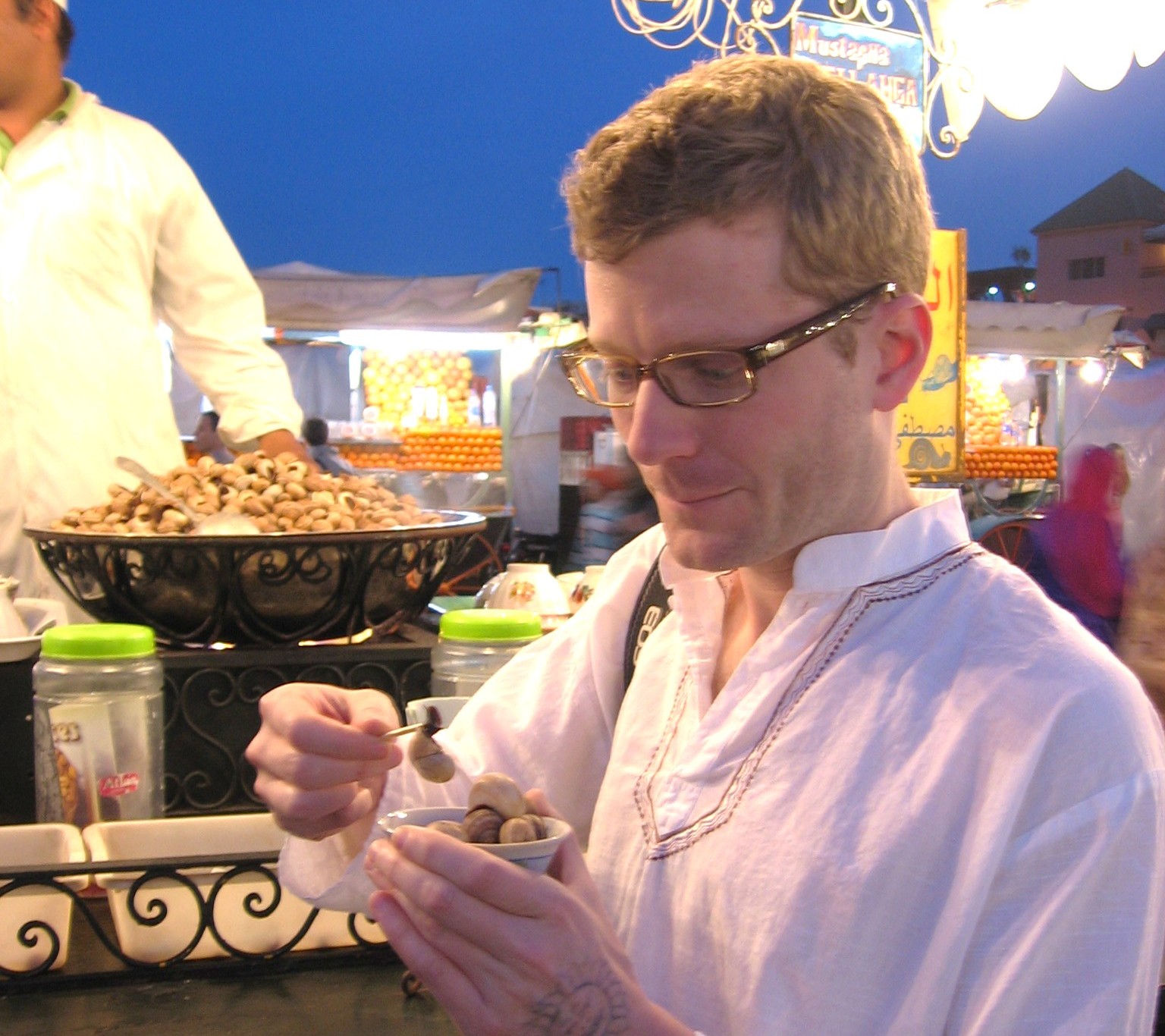 We grab a few hours of sleep before heading back to the city to see the Marrakech nightlife. The central square of the Medina is bustling with tourists and street vendors. We grab a bowl of snails from a stand for 5 dirhams (about $0.65). This is the cheapest food we ate and some of the tastiest. These are not French snails drowned in garlic butter, but Moroccan, boiled in spiced water, still clinging to their shells. Just off the Medina winds street after street of souks: small shops selling touristy goods to the streaming parade of visitors. I think I’ve finally overdosed on souvenirs and enjoy just watching all the madness. I’m enthralled watching a man lathe some shish kebab skewer handles with his feet. He uses his hands to spin the dowel along its axle using a little bow. It’s as if he’s trying to start a fire on a desert island. With his foot he pushes the chisel into the dowel, notching out intricate details into the wood.