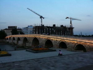 After a quick shower and change of clothes, I feel good enough to go back into town for a real dinner. I make it all the way to the city center (called Macedonia Square) which seems like their Champs Elysees and Time Square rolled into one. There are all sorts of streetfront cafes and signature stores. A stone bridge separates this new part of the city from the historic core across the Vardar River.